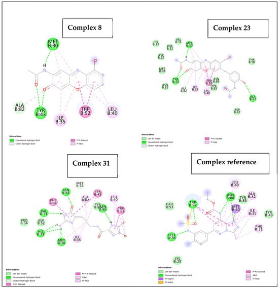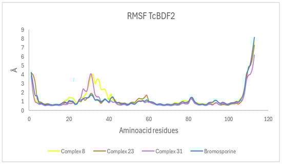 RMSF profiles because they formed hydrogen bonds with Met30 and Tyr43. Our results revealed that the Complexes 8, 23, and 31 exhibited greater stability than the reference TcBDF2 complex (Figure 3).