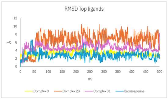 RMSD plot of the ligands, the Y axis in angstroms, and the X axis in nanoseconds indicates the evolution of ligand stability with respect to the protein and its pocket. The plot shows the values of Complexes 8, 23, and 31 and the reference ligand (bromosporine).