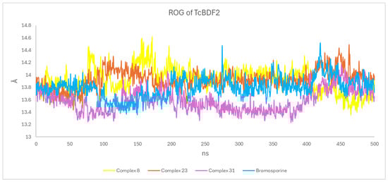 We investigated how binding to various compounds changes the protein’s structural compactness. Therefore, we determined the RoG as a function of time. A ligand tends to be flexible and unstable when RoG is high enough. On the other hand, conformations with lower RoG values are typically dense and closely packed [47]. The RoG values for all systems are consistently between 13.2 Å and 14.8 Å, signifying that the TcBDF2 protein retains a compact and stable structure during 500ns. TcBDF2 protein compactness was higher in Compounds 23 and 31 than in bromosporine, which is in line with the findings of RMSD analysis of the protein backbone (Figure 4).