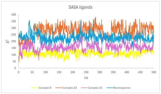 SASA (solvent accessible surface area) profiles for Compounds 8, 23, and 31 and bromosporine complexes.