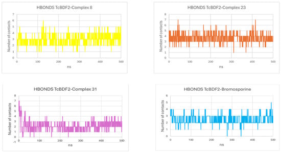 HBONDS (hydrogen bonds) profiles for Compounds 8, 23, and 31 and bromosporine complexes.