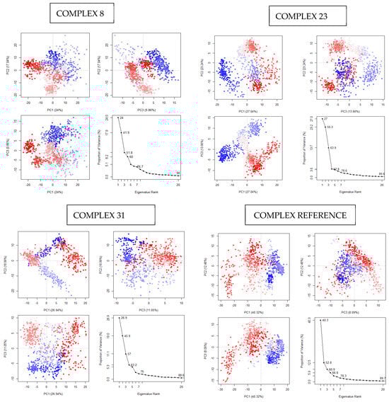 The statistical technique Principal Component Analysis (PCA) reduces the dimensionality of data. In this instance, the ligand-induced significant changes in the backbone C atoms through its application. This technique distinguishes between the residual and essential protein motions. The critical motions, usually the largest-scale movements, frequently include biologically important movements like opening, shutting, and flexing. The remaining motions represent minor, less significant local changes [50]. Figure 7 shows that the first three PCs in the simulations for TcBDF2, TcBDF2 Compound 8, TcBDF2 Compound 23, and TcBDF2 Compound 31 accounted for 24%, 27.04%, and 26.94% of the total number of variances in the generated data. These numbers illustrate the range of simulated conformations. The systems bound to Compounds 8, 23, and 31 exhibited slightly wider ranges. These ligands cause stronger structural motions than the reference ligand (bromosporine). Additionally, we observed a total variance of 90% for the first principal component in Complex 8. Likewise, the variation was 89.6% for Complex 23 and 88.6% for Complex 31. The results prove that Complex 8 enhanced the motion of the protein’s Cα-atoms. Accordingly, this data implied that ligand interaction modifies TcBDF2′s conformation.