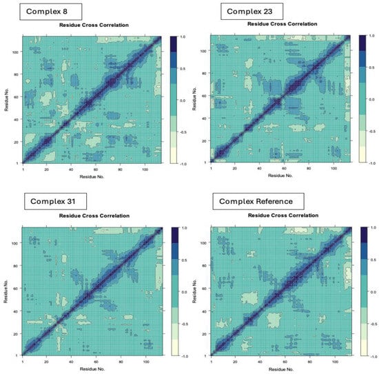 A DCCM plot was made to examine the correlated movement of structural domains to reach a stable conformational state of the complex after binding to the chosen compounds (Figure 8). The matrix plot’s distinct color patterns represent varying correlation levels [51]. The positively correlated motions are depicted in dark blue, while negatively anti-correlated motions are shown in white, and mixed correlations are illustrated in cyan. Complex eight reduced anti-correlated movements while preserving moderate correlated motions in TcBDF2, indicating stable and correlated residue dynamics. Next, the compound lowered correlated motions and created widespread anti-correlated motions. This made TcBDF2 more flexible and less stable structurally. Subsequently, Complex 31 maintained correlated motions while producing localized anti-correlated motions, indicating moderate stability and flexibility in TcBDF2. The DCCM analysis showed that complex 8 induced a robust open structure ensemble in the protein, which was ascribed to the flexibilities of various residues in this state, despite both systems (Complexes 23 and 31) exhibiting both open and closed conformations in comparison with the bromosporine.