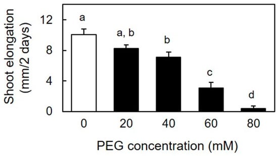 Effects of osmotic stress on elongation of etiolated rice shoots. Imbibed caryopses were initially cultivated in deionized water for 2 days, resulting in a shoot length of 2.7 ± 0.1 mm. Subsequently, the seedlings were transferred to either deionized water or various concentrations of PEG solutions and grown for an additional 2 days. The data are presented as the means ± SE (n = 15–16). Different letters above the bars denote statistically significant differences (Tukey’s HSD test, p < 0.05).
