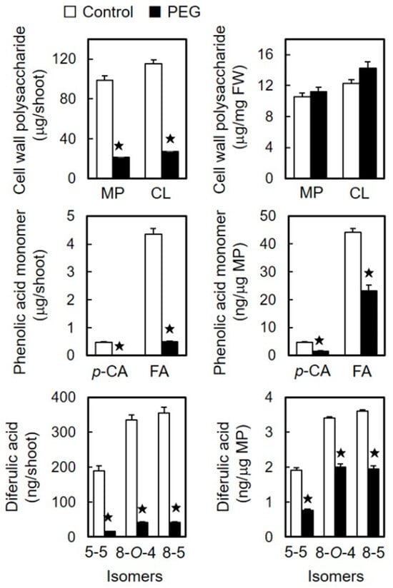 Effects of osmotic stress (60 mM PEG) on the amounts of cell wall polysaccharides, cell-wall-bound phenolic acid monomers, and cell-wall-bound diferulic acids in rice shoots. The growth conditions are depicted in Figure 1. MP, matrix polysaccharides; CL, cellulose; p-CA, p-coumaric acid; FA, ferulic acid. The data are presented as the means ± SE from three independent samples. ★ Significant differences in the mean values between the control and PEG treatment (Student’s t-test, p < 0.05).