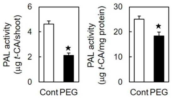 Effects of osmotic stress (60 mM PEG) on the activity of PAL in rice shoots. The growth conditions are depicted in Figure 1. The PAL activity was quantified by the production of t-cinnamic acid (t-CA) during the assay. The data are presented as the means ± SE from four independent samples. ★ Significant differences in the mean values between the control and PEG treatment (Student’s t-test, p < 0.05).