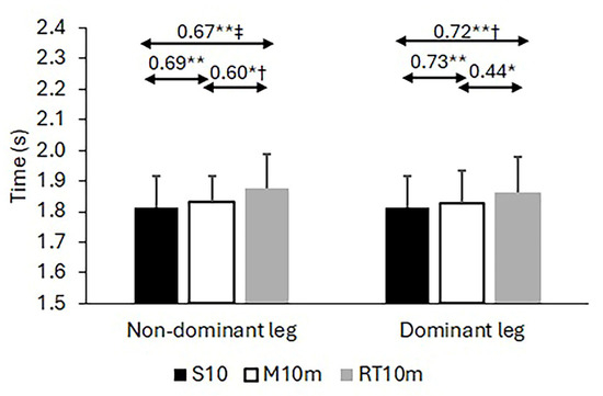 Validity of 10 m sprint times obtained from standard 10 m sprint and classic version of 505 test. Note: * significant correlation at p < 0.05; ** significant correlation at p < 0.01; †—difference significant at p < 0.05; and ‡—difference significant at p < 0.01.