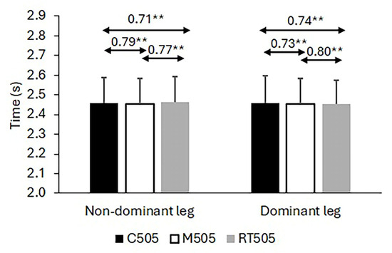 Adding a reaction-time component in the modified protocols introduced slightly higher variability than time-based metrics. Reaction times showed CV% values of 8.64% for the non-dominant leg and 7.48% for the dominant leg, with ICC values of 0.799 and 0.805, respectively, indicating good relative reliability. Changes in mean values ranged from −2.91% to 1.90%, and no significant differences between trials were detected.