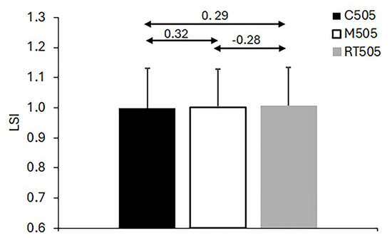 Cohen’s d effect size was calculated to assess the practical significance of differences, with thresholds defined as trivial (<0.2), small (0.2–0.5), moderate (0.5–0.8), large (0.8–1.3), and very large (>1.3) [24]. Effect sizes were computed using the harmonic mean of the standard deviations (SDs) of the compared conditions, with a threshold of d = 0.20 considered the minimum for practical significance. Effects were deemed unclear if the 95% confidence intervals (CIs) included both positive and negative values; otherwise, effects were classified as clear.