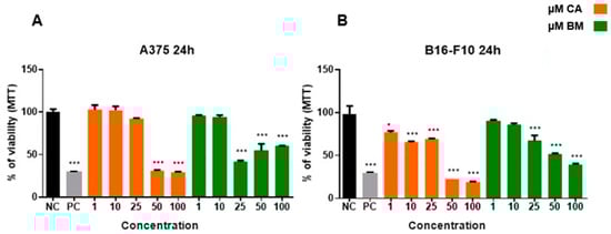 In Figure 1B, it is notable that B16F10 cells treated with CA concentrations of 50 and 100 µM decreased cell viability by 69.5% and 71%, respectively, compared to the negative control. In addition, B16F10 cells exposed to BM concentrations of 25, 50, and 100 µM decreased cell viability by 58.5%, 45.4%, and 40%, respectively, compared to the negative control.