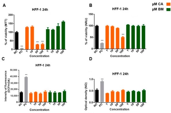 To verify whether the cytotoxic concentrations of CA and BM in melanoma cells would cause a viability reduction and cytotoxicity on normal cells, the fibroblast cell line (HFF-1) was assessed. CA and BM effects on HFF-1 cell viability are shown in Figure 2. The concentration of 50 and 100 µM of CA significantly reduced the percentage of viable cells compared to the negative control (Figure 2A). Likewise, 100 µM of CA decreased neutral red cell uptake viability (p < 0.0001) (Figure 2B). No differences were observed in ROS and NO analyses (Figure 2C,D) (p > 0.05).