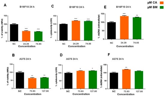 Determination of cytotoxicity by MTT (A,B), LDH (C,D), and free dsDNA (E,F) in B16F10 and A375 cells exposed to IC50 values for BM and CA. Statistical analysis was performed comparing treatment groups to negative control (NC), and statistically significant values were considered as follows: * p ≤ 0.05; ** p ≤ 0.01; *** p ≤ 0.001. Tukey’s post hoc test; two-way ANOVA.
