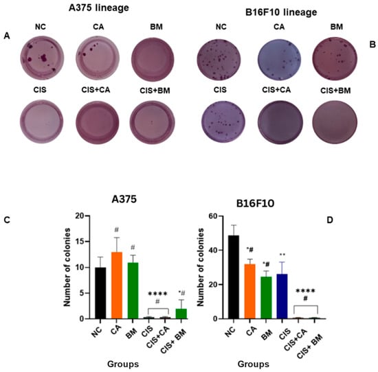 Effects of carotenoids and biomass in colony formation. Treatment concentrations applied: 50 µM of CA or BM, 100 µM of cisplatin, or a combination of them. A negative control (NC) was also present: (A,C) A375 lineage; (B,D) B16F10 lineage. Statistical analysis was performed comparing treatment groups to the negative control (NC), and statistically significant values were considered as follows: * p ≤ 0.05; ** p ≤ 0.01; **** compared to negative control; # difference among treatment groups. the Tukey’s post hoc test; two-way ANOVA.