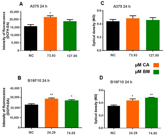 The oxidant status in A375 and B16F10 cell lines exposed to CA and BM was assessed using a fluorescence assay (DCFH-DA) and measurements of nitric oxide (NO) levels. Cells exposed to CA showed a significant increase in the release of reactive species compared to the control group in both cell lines (p < 0.01). In B16F10 cells, BM exposure led to increased fluorescence intensity 24 h post-exposure compared to the negative control. Additionally, nitric oxide release was stimulated in B16F10 cells exposed to CA and BM compared to the negative control. However, in the A375 cell line, the compounds did not alter nitric oxide release (Figure 5).