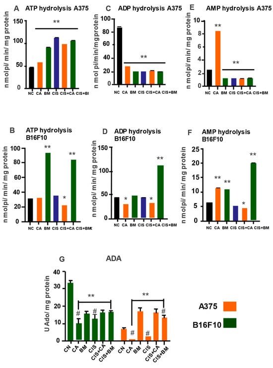 Hydrolysis of extracellular nucleotides and nucleosides in melanoma cells exposed to carotenoid extracts and total biomass: (A,B) NTPDase1 (using ATP as a substrate); (C,D) NTPDase1 (using ADP as a substrate); (E,F) 5′-Nucleotidase; (G) Adenosine deaminase (E-ADA). The treatment concentration applied were 50 µM for both CA and BM. Cisplatin was used at a concentration of 100 µM. Then, combinations of these same concentrations were performed. Values are expressed as mean ± SEM. Data were analyzed by two-way ANOVA followed by Tukey’s post hoc test. A statistical analysis compared treatment and control groups (NC). Statistically significant values were considered as follows: * p ≤ 0.05; ** p ≤ 0.01; # difference among treatment groups.