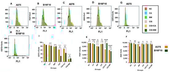 CD73-positive cells were shown diminished with CA, BM, CIS, and the combinations of CIS + CA and CIS + BM treatments in A375 and B16F10 melanoma cell lines when compared to the negative control group (Figure 7I).