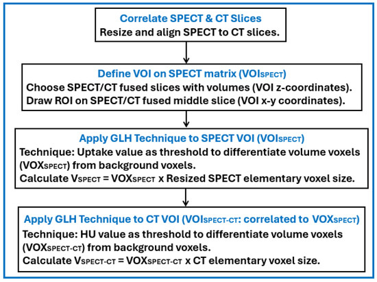 MATLAB (R2022a) [31] was utilized to calculate small volume sizes in SPECT/CT imaging. A number of key MATLAB tasks were performed such as correlating SPECT and CT matrices, defining the volume of interest, and applying the GLH technique twice in order to differentiate volumes from background. Figure 1 summarizes these tasks.
