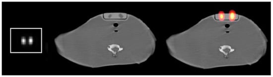 I-123 and I-131 SPECT/CT images from a neck–thyroid phantom with small sizes of volumes (0.5, 1, 1.5, 3, and 10 mL) were utilized to validate the method. The phantom was specifically designed for postsurgical thyroid imaging and was developed using 3D printing and molding techniques [28]. The phantom can accommodate two small sizes of volumes and can simulate different background-to-volume activity ratios. Other structures, such as the trachea, esophagus, cervical spine, and clavicle, were also anatomically enclosed within the phantom. Figure 2 presents slices from the phantom: a SPECT slice with the 1.5 and 3 mL volumes and the corresponding axial CT and SPECT/CT fused slices.