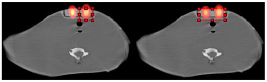 Even though the GLH technique can calculate multiple thresholds for images with more than two intensity classes, it would be preferable, when possible, to draw a ROI within the same anatomical structure, that is, to enclose only the volume(s) and the surrounding environment (two HU classes with even low HU difference). In most of the cases, the separation distance between two nearby volumes ranged from 1 to 2 cm. For a smaller separation distance (e.g., 0.5 cm, as shown in Figure 4b), while two volumes could be distinguished on a SPECT/CT fused slice, the algorithm could only process calculations when the ROI included both volumes. At a separation distance of 0.5 cm (Figure 4b) compared to 1 cm (Figure 4a), the calculated volumes (1.5 and 3 mL) were 10% less accurate. Hence, a separation distance between nearby volumes of at least 1 cm is considered as a limitation for accurate calculations.