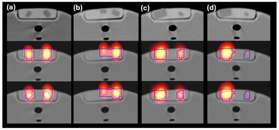 (Top) The CT middle slice from the phantom including two volumes. (middle, bottom) The corresponding I-131 SPECT/CT fused middle slice on which the VSPECT (blue-colored outer loop) and VSPECT-CT (purple-colored inner loop) are projected. VSPECT and VSPECT-CT are the calculated volumes from the SPECT and CT VOIs, respectively. From left to right of each image, the volumes are: (a) 1.5 and 3 mL with an 1 cm separation distance, (b) 1.5 and 3 mL with an 0.5 cm separation distance, (c) 10 and 1 mL, and (d) 10 and 0.5 mL.