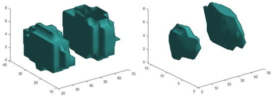 The last task was to apply the GLH to a CT VOI (VOISPECT-CT) using the same MATLAB function as above. The VSPECT voxels were used to define VOISPECT-CT, as SPECT and CT voxels were correlated beforehand. The HU was utilized to derive the threshold for differentiating the volumes from the background. In VOISPECT-CT, unlike in VOISPECT, the HU difference between the volumes and the background was not very well distinct. Hence, an adaptive HU threshold was utilized that was determined by reading the HU distribution within the VOISPECT-CT, identifying similar HU regions, and calculating the minimum and maximum percentiles for each similar HU region. VSPECT-CT was calculated from the number of voxels, considered as volume, times the CT elementary voxel size. VSPECT and VSPECT-CT are projected on the SPECT/CT fused middle slice in Figure 4, and they can be 3D-visualized in Figure 5.