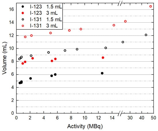 Table 1 presents the number of I-123 and I-131 SPECT/CT acquisitions for different administered activities within a specific volume size and the % difference (%ΔV) between V and VSPECT-CT. VSPECT-CT represents the average value when the VOI included only one volume, as explained in a previous section. %ΔV is larger for smaller volumes due to PVE [26,27]. Even though VSPECT-CT was calculated by applying the GLH technique to a CT VOI with an elementary voxel size of 1.1 × 1.1 × 4.4 mm rather than to a SPECT VOI with an elementary voxel size of 4.4 × 4.4 × 4.4 mm, it is still affected, to a lesser extent, by PVE. Note that the 0.5 mL volume could be measured in three consecutive slices, and the 1 and 1.5 mL volumes in four and five consecutive slices, respectively.