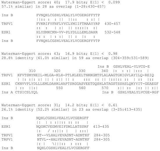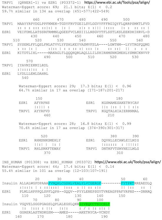 - Root-Bernstein, R.; Podufaly, A.; Dillon, P.F. Estradiol Binds to Insulin and the Insulin Receptor Decreasing Insulin Binding in vitro. Front. Endocrinol. 2014, 5, 118. [Google Scholar] [CrossRef]