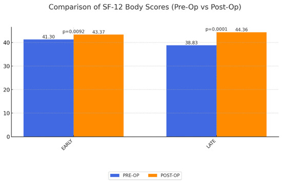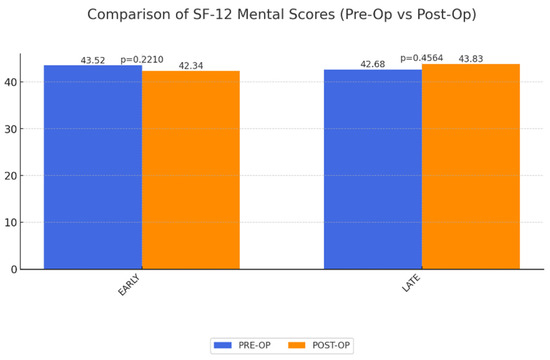SF-12 Physical and Mental Component Scores: Analysis showed a statistically significant improvement in physical QoL in both groups when compared to preoperative levels. These physical improvements likely facilitate better mobility and reduced discomfort, which are critical for the daily lives of MWL patients. Conversely, mental QoL showed no significant short-term and long-term change (Figure 1 and Figure 2).