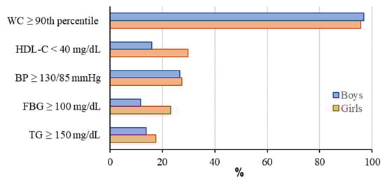 Girls were found to have significantly higher levels of increased FBG and lower HDL-C, both components of MetS (p < 0.05) (Figure 1).