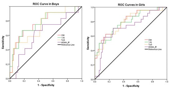 As a result of the ROC analysis, CMI demonstrated the largest and most significant AUC in predicting MetS in both boys and girls (Table 3). HOMA-IR, which ranked last in both genders, did not have a statistically significant AUC value in boys.