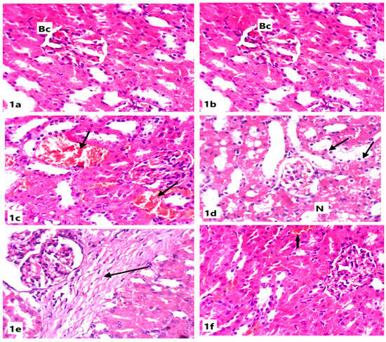 Renal tissues of rats from the ABG-extract-treated group did not show any histopathological alterations when compared with control rats as the renal corpuscles and tubules appeared normal (Figure 1a,b). Examination of the renal cortex of SB-treated rats showed congested blood vessels and severe interstitial hemorrhage (Figure 1c,d); tubular degeneration, as some tubules showed complete loss of the lining cells (Figure 1d); atrophy in glomeruli; widening in the Bowman’s capsule; and tubular dilatation (Figure 1e).