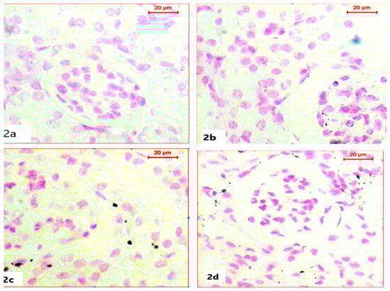 For the histochemical demonstration of DNA content in nuclei, sections were stained with Feulgen’s reaction to demonstrate DNA as a magenta color. Sections of kidneys of both the control group and ABG-extract-treated groups revealed normal DNA contents in both Bowman capsules and tubules as all nuclei appeared in a spherical shape with a strong magenta color; however, ABG extract did not induce any alteration in DNA content (Figure 2a,b). In a comparison with the control group, SB caused a marked reduction in the number of nuclei and in also in DNA content, which was explained by the mild to moderate magenta color in the renal cells of kidney sections, as well as the decrease in nuclei size (Figure 2c). Renal tissues obtained from rats treated with both ABG extract and SB exhibited marked restoration of nuclei numbers and their strong magenta-colored DNA contents when compared with the SB-treated group (Figure 2d).