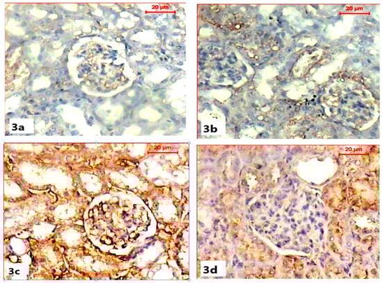 Immunohistochemical demonstration of pre-apoptotic protein (caspase-3) activity in the renal tissues of both control and ABG-treated rats revealed the normal absence to mild immunoreactivity of caspase-3 in renal capsules and tubules (Figure 3a,b). Microscopic examination of the renal sections obtained from the SB-treated group showed a marked increase in caspase-3 immunoreactivity with a strong brown color in the renal cortex, especially within Bowman capsules, when compared with the control group (Figure 3c). Co-treatment with ABG extract and SB resulted in the marked inhibition of the caspase-3 reaction as the renal tissue appeared with a mild brown color when compared to SB-treated group (Figure 3d).