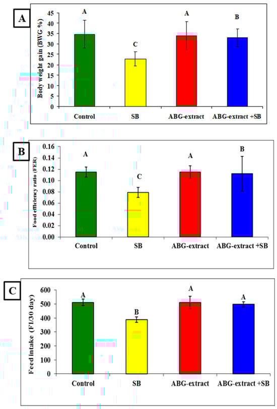 Data in Table 3 and Figure 4 showed significant decreases were recorded in the SB-treated group in the body weight gain (BWG %), food efficiency ratio (FER), and feed intake (FI/30 days) when compared with the control group. Co-treated rats with ABG extract and SB induced significant improvement in the body weight gain (BWG %), food efficiency ratio (FER), and feed intake (FI/30 day) values when compared with the SB-only-treated group.