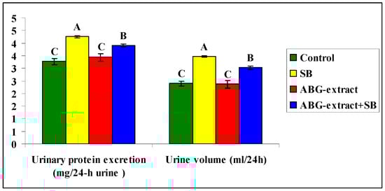 Data shown in Table 4 and Figure 5 revealed a significant increase in urinary protein excretion and urine volume caused by SB treatment, by comparing with the control group, which both were diminished as a result of double treatment with ABG extract and SB when compared with the SB-only treated group.