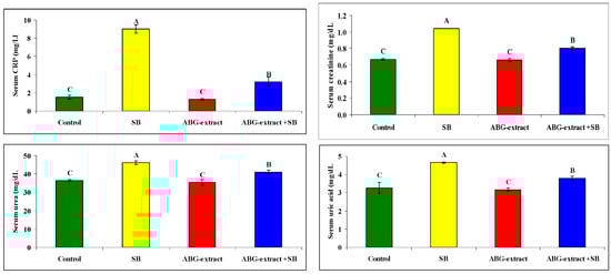 Serum and urine investigations revealed that SB resulted in a significant increase in each of the serum creatinine, serum urea, and serum uric acid, with a significant decrease in urinary creatinine, urinary urea, and urinary uric acid when compared with the control group. On the othesr hand, rats treated with both ABG extract and SB revealed significant decreases in serum urea, uric acid, and creatinine. This was in parallel with the significant increase in urinary urea, uric acid, and creatinine when compared with SB-only-treated group .Concerning the inflammatory status, ABG extract succeeded in modulating renal inflammation as rats treated with both ABG extract and SB revealed a significant improvement in CRP which were elevated significantly in rats treated with SB only, as shown in Table 5 and Figure 6.
