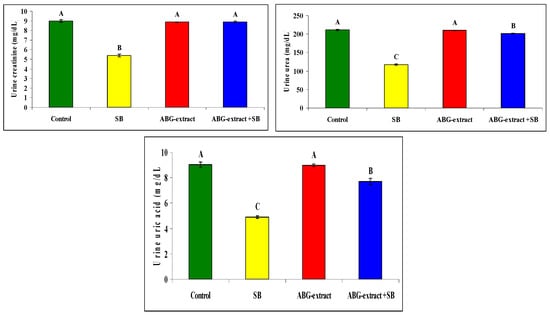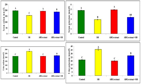 Serum sodium and potassium were decreased significantly in SB-treated groups when compared with the control group while they improved significantly and recorded near normal values in the ABG-extract- and SB-treated group when compared with the SB-only-treated group. Meanwhile, urinary sodium and urinary potassium were significantly increased in the SB-treated group when compared with the control group, which was improved by co-treatment by SB and ABG extract as urinary sodium and potassium were significantly increased when compared with SB-treated animals ,as shown in Table 6 and Figure 7