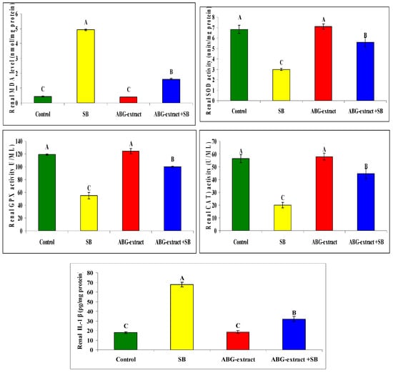 For antioxidant demonstration in renal tissue, colorimetric methods via a spectrophotometer were applied. Kidneys were homogenized and centrifuged at 3000 for 20 min; clear supernatants were separated for analyzing malondialdehyde (MDA) [23], superoxide dismutase (SOD) [24], catalase (CAT) [25], and glutathione peroxidase (GPx) [26]. Meanwhile, a renal assay for antiinflammatory Interleukin IL-1β was performed using their respective ELISA kits supplied by Abcam (Waltham, MA, USA).