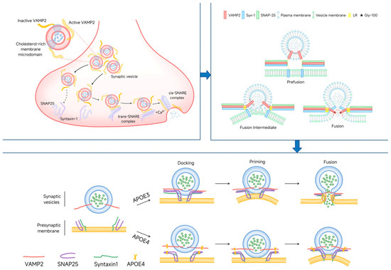 The upper section illustrates the role of the SNARE complex in the synaptic vesicle release process, while the diagram on the right provides a more detailed depiction of the three stages of vesicle fusion mediated by the SNARE complex. The lower section compares the effects of APOE3 and APOE4 on the function of the SNARE complex. APOE3 maintains SNARE complex stabilization and ensures vesicle docking and fusion to release neurotransmitters; in contrast, APOE4 disrupts the interaction of VAMP2 and SYNTAXIN1 with SNAP25 and impairs synaptic function.