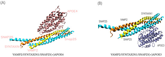 Docking protein complex (A) VAMP2/SYNTAXIN1/SNAP25(+)APOE4, (B) VAMP2/SYNTAXIN1/SNAP25(+)APOE3. Among them, the pink one is APOE4, the orange one is SYNTAXIN1, the yellow one is VAMP2, the blue one is SNAP25, and the dark blue one is APOE3.