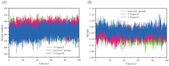 While the number of hydrogen bonds can somewhat reflect the structural stability, folding state, and functional activity of proteins, hydrogen bonds are crucial for preserving protein stability and achieving their functions. They are also a key mechanism for indicating the strength of protein interactions [47]. One crucial metric for characterizing a protein molecule’s compactness or folding state is its radius of gyration. Thus, as illustrated in Figure 4, we examined the radius of gyration and the number of hydrogen bonds between VAMP2/SYNTAXIN1/SNAP25 in order to determine whether the addition of APOE4 influences their binding. While (+)APOE4′s radius of gyration greatly expanded during the simulations, the number of SNARE protein hydrogen bonds significantly decreased (Figure 4A). We also studied the distance and angular distribution of hydrogen bonds and the average period of existence to show the reality of the hydrogen bonds found during the simulations. The results showed that the hydrogen bonds formed were stable and effective because the distributions were narrower, the average angular distributions were smaller, and the overall distances of the hydrogen bonds were shorter. The hydrogen bond distances and angular distributions showed that the hydrogen bonds were comparatively stable throughout the three simulated systems. In addition, as shown in Figure 4B, the radius of gyration (Rg) was calculated to assess the protein’s overall compactness. A larger Rg, associated with fewer hydrogen bonds, suggests a looser and less stable structure. For the SNARE complex, an increased Rg implies greater flexibility and potentially compromised structural integrity. This flexibility may directly impact synaptic function, contributing to dysfunction by disrupting the precise interactions required for efficient neurotransmitter release.