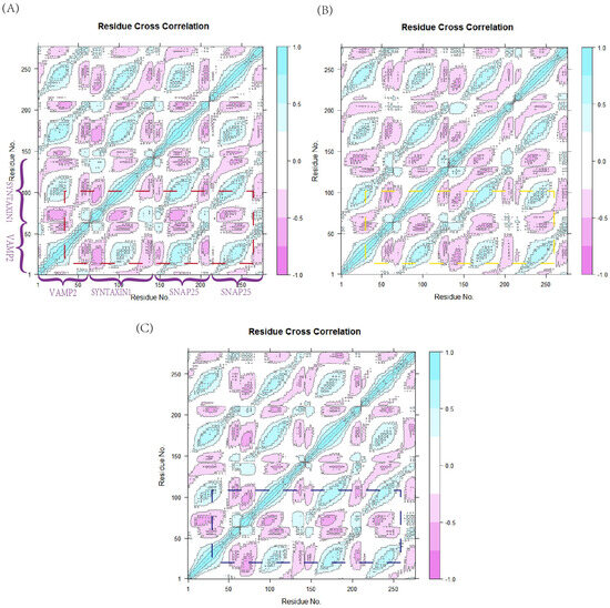 We employed a dynamic correlation matrix analysis to investigate the functional displacements of SNARE complexes over time, aiming to gain deeper insights into how APOE4 decreases SNARE stability and to identify potential functional sites or critical structural domains [48]. For the correlation analysis, stable MD simulations with durations ranging from 50 to 70 ns were used. The correlation values were calculated by measuring the distance between any two residues in a 20 ns trajectory. If the distance was less than 4.5 Å in 75% of the frames, the correlation value was considered constant; otherwise, it was assumed to be zero. A positive correlation was defined when two residues moved together in the majority of frames, resulting in a positive correlation value, while a negative correlation was observed when residues moved in opposite directions in most frames. If the correlation coefficient between two residues was close to zero, their motions were considered independent. The results of the dynamic correlation analysis of the SNARE interaction interface are shown in the figure. The magnification and deepening of the red areas in Figure 5A,B indicate that the correlation between VAMP2 and SYNTAXIN1 and SNAP25 residues in the (+)APOE4 or (+)APOE3 complexes was lower compared to those in the control group in Figure 5C. By combining these results with the RMSF fluctuations of the residues and using PyMOL2.5 visualization software, we identified the following residues interacting with the SNARE protein complex: residues 50-60 of VAMP2, 210-235 of SYNTAXIN1, and 145-155 of the SNAP25/2 chain. In the (+)APOE4 complex, residues in VAMP2 exhibited low dynamic correlation with residues in SYNTAXIN1 and SNAP25. Interestingly, when comparing Figure 5A,B, the dynamic correlation of the (+)APOE4 protein complex was found to be significantly lower than that of the (+)APOE3 complex.