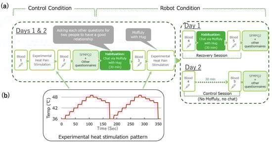 - Day 1: The Robot condition concluded with a Recovery Session, during which participants casually chatted with Moffuly for 30 min before providing the final blood sample and completing the questionnaires.