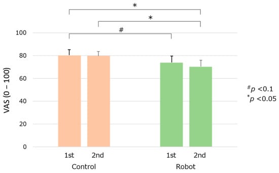 Statistical analyses were conducted using JMP®, Version 16.0 (SAS Institute Inc., Cary, NC, USA). We performed a paired t-test to compare the Control and Robot conditions data. Statistical significance (α) was set at 0.05. Additionally, p-values between 0.05 and 0.1 were considered to indicate a trend or tendency toward significance, which may warrant further investigation in future studies with larger sample sizes. While additional significance levels (e.g., ** p < 0.01 and *** p < 0.005) were used in the figures for descriptive purposes, they are statistical tools to indicate varying levels of evidence against the null hypothesis and do not necessarily imply qualitative differences in the biological or clinical importance of the findings. We performed effect size estimation using Cohen’s d test for the paired t-test using the formula d = MeanD/SDD, where D = differences of the paired samples values []. All data reported in the figures are presented as the means ± SEM.
