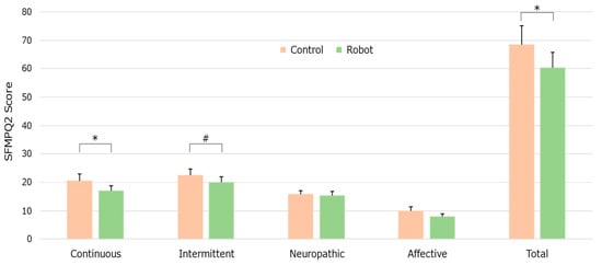 Changes in the pain quality expressed by SFMPQ-2 in the Control and Robot conditions. Significant differences are indicated as # p < 0.1 or * p < 0.05.