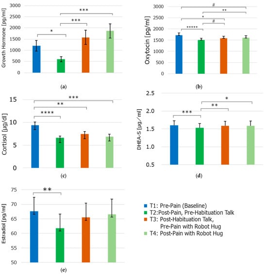 Changes in the serum hormonal levels of (a) growth hormone, (b) oxytocin, (c) cortisol, (d) DHEA-S, and (e) estrogen (in the form of estradiol) across four time points: T1 (baseline), T2 (post-pain without a robot hug), T3 (post-habituation and pre-pain with a robot hug), and T4 (post-pain with a robot hug). The data from T5 (end of experiment) are excluded, as they reflect recovery or control conditions and were less relevant to the comparisons of the robot’s presence and interaction during the heat pain stimulation. Significant differences are indicated as # p < 0.1 (trend toward significance), * p < 0.05, ** p < 0.01, *** p < 0.005, **** p < 0.001, and ***** p < 0.0005.