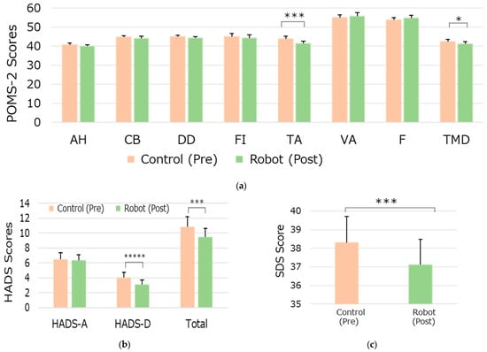 Results of the mood and mental status assessment questionnaires: (a) POMS-2, (b) HADS, and (c) SDS. Significant differences are indicated as * p < 0.05, *** p < 0.005, and ***** p < 0.0005.