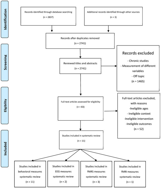 The primary outcome measure was at least one core EF (inhibition, cognitive flexibility, and working memory) assessed within 45 min of exercise cessation; this was reviewed. In addition, neurophysiological outcome measures, including EEG, fNIRS, and fMRI, assessing core EF were included.