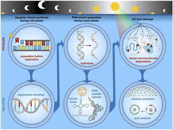 We propose that these (roughly) simultaneous selection forces were critical for the development of capabilities to assess temporal information that anticipated the onset of daytime hazards and, thus, prevented hydrolysis while simultaneously producing changes that protected the protocell from UV damage; that is, the melting of double-stranded RNA due to increasing temperatures during daytime hours and the subsequent adaptations to prevent hydrolysis also produced molecular machinery to shield cellular components (e.g., membrane) from damage from UV light. We hypothesize that this is the origin of the informational dynamics still observed in the circadian changes of extant living systems [47].