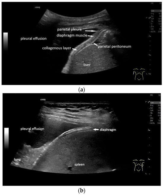 Diaphragm on the right (a) and left (b). Hypoechoic muscle, covered to the pleural cavity by the hyperechoic parietal pleura and to the abdomen by the hyperechoic peritoneum. In the center of the muscle there is another echogenic layer, which corresponds to narrow collagenous fibers. The diaphragm is particularly visible here, as it is not overlaid by lung artifacts in a pleural effusion.